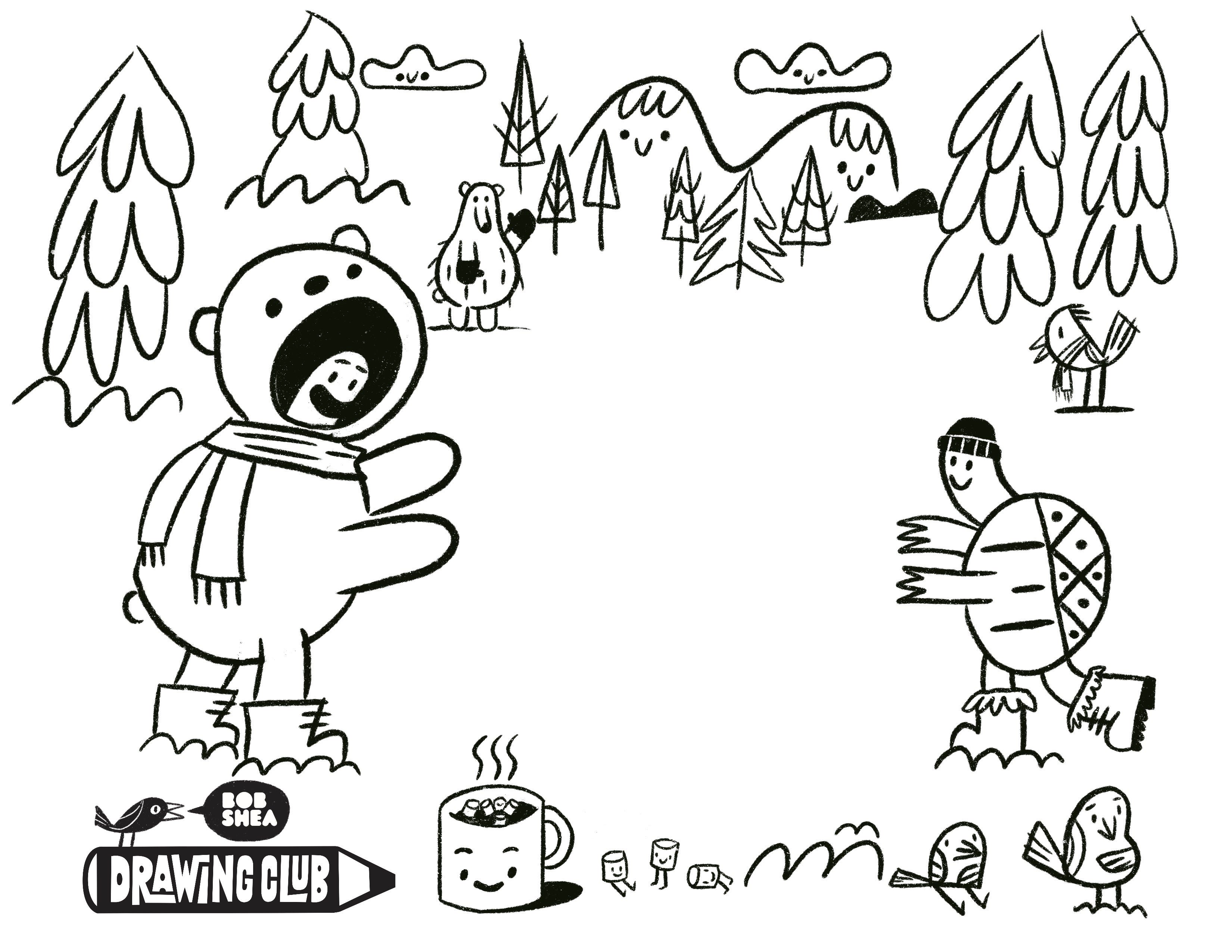 Can you help Bearsuit Turtle and Turtle make snowmen? Draw the fanciest snowmen you can and then have some hot chocolate. Click here to download!